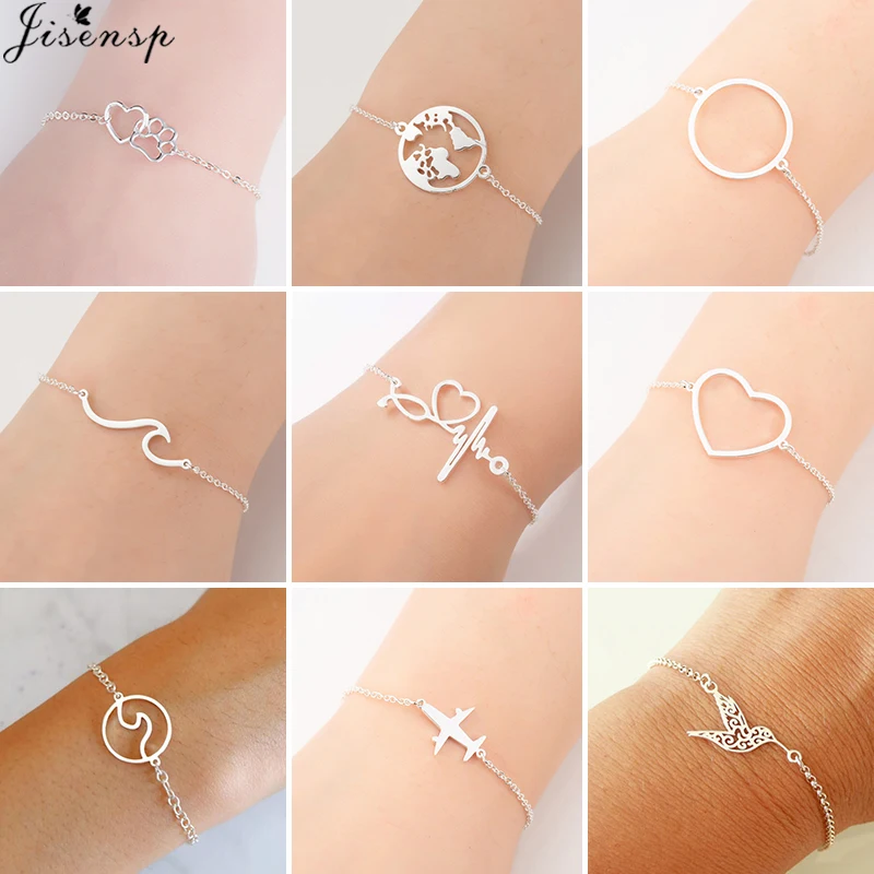 Name: Pulseras de acero inoxidable para mujer, brazalete de cadena ajustable, mapa del mundo Simple, brazaletes de huella de corazón, regalo de amistad